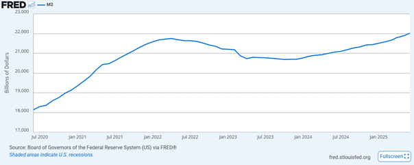 Odbicie M2 zapewnia makroekonomiczny impuls, który wspiera podejmowanie ryzyka, gdyż mówi o zwiększonej płynności. Informuje też luźniejszych warunkach finansowych oraz o mniejszej presji na rynki kredytowe. Wyższe poziomy M2 zazwyczaj korelują ze zwiększoną płynnością, co jest korzystne dla akcji (szczególnie dla głównych amerykańskich indeksów jak NASDAQ i S&P 500), ale zwiększa ryzyko inflacyjne. Tak, jak miało to miejsce w latach 2021-2022. Powodem był gwałtowny wzrost M2 w USA po symulacjach fiskalnych i luzowaniu ilościowym, co spowodowało silny rajd akcji technologicznych, krypto i nieruchomości.